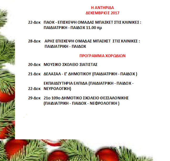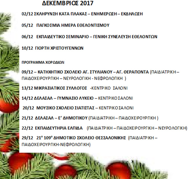 09/12 Κατηχητικό Σχολείο Αγ. Στυλιανού – Αγ. Θεράποντα (Παιδιατρική – Παιδοχειρουργική – Νευρολογική – Νεφρολογική) 13/12 Μικρασιατικός Σύλλογος (Σαλόνι) 14/12…